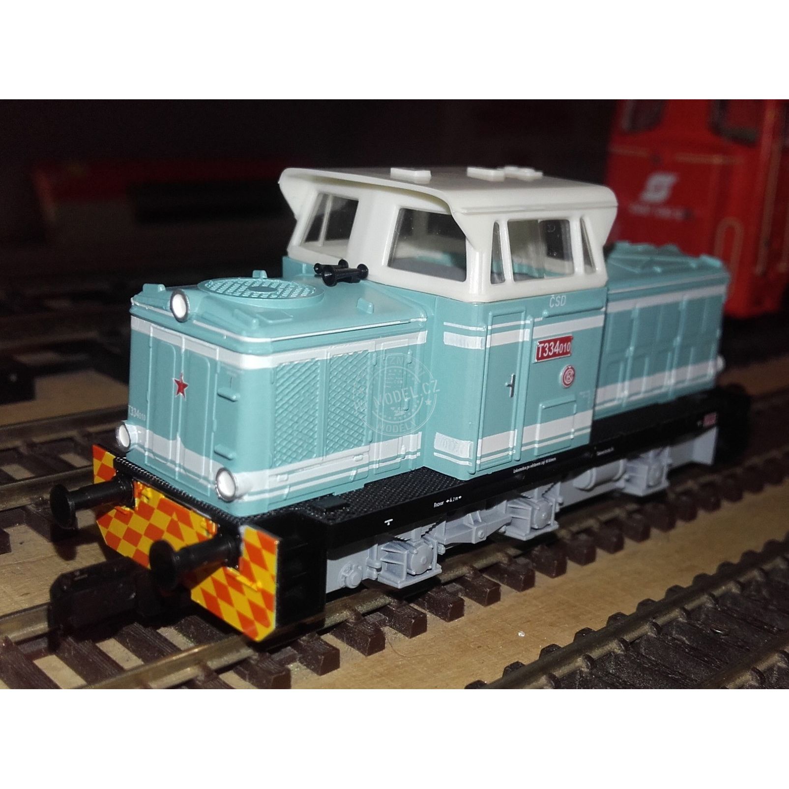 Motorová lokomotiva T 334.024 ČSD. V původní světle zeleném nátěru po dodání z ČKD.